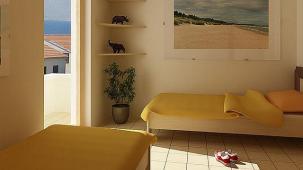 This apartment with nice shades of blue and a beautiful bathroom will help you to relax after work.